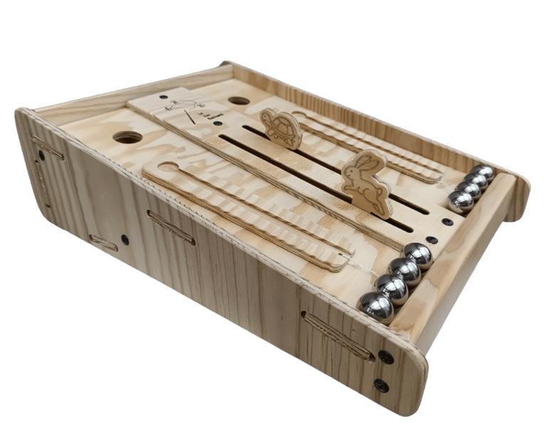 Prenez le parti du lièvre ou de la tortue, et lancez-vous dans une course effrénée ! À l’aide du lanceur, faites rouler vos billes avec précision pour viser votre trou : chaque bille bien placée fait avancer votre champion. Le premier à franchir la ligne d’arrivée gagne... mais attention, rien n’est joué avant la dernière bille !
