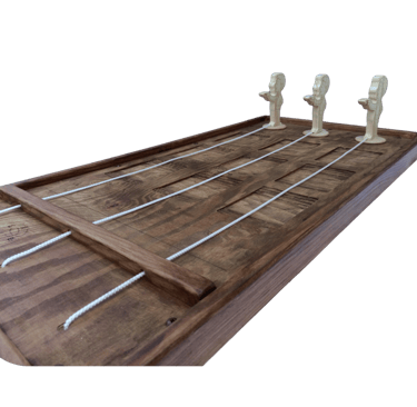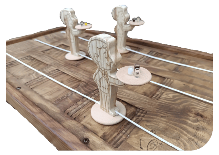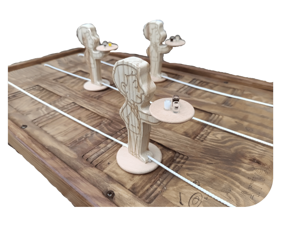 Garçons de Café est un jeu en bois géant dans lequel trois personnes s’affrontent lors d’une course exaltante.